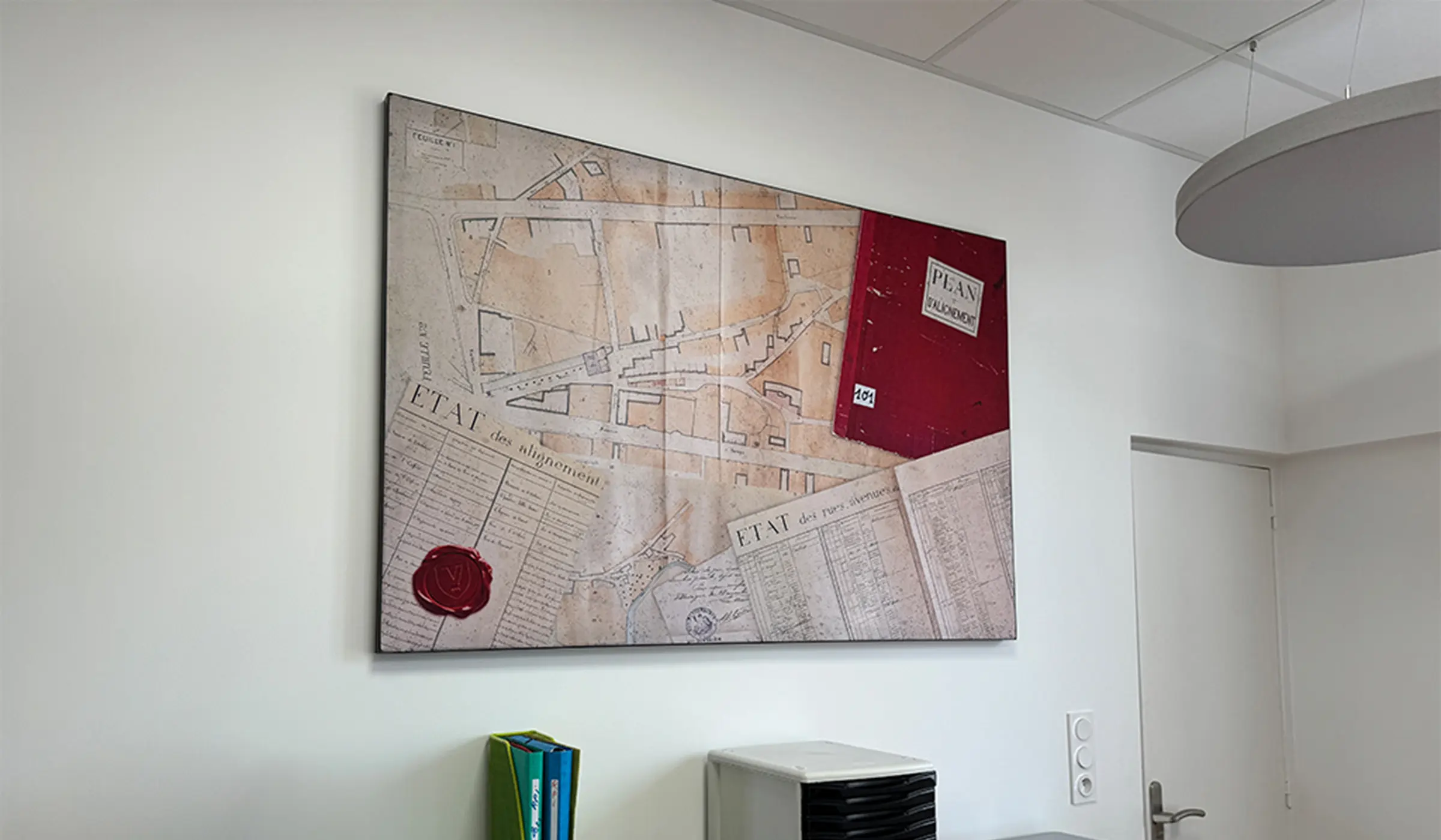 avec des capteurs suspendus en tissu aux couleurs de la commune, des Tablofotos avec le logo de Villedaigne et celui de la Poste, une suspension en PET jaune et blanche à la sortie de l’ascenseur pour capter le bruit de celui-ci (Liegecho), des panneaux Echowood pour amener de la chaleur, et un magnifique Tablofoto de 1m*1m50 (réalisé avec d’anciens documents d’urbanisme scannés par la mairie).
