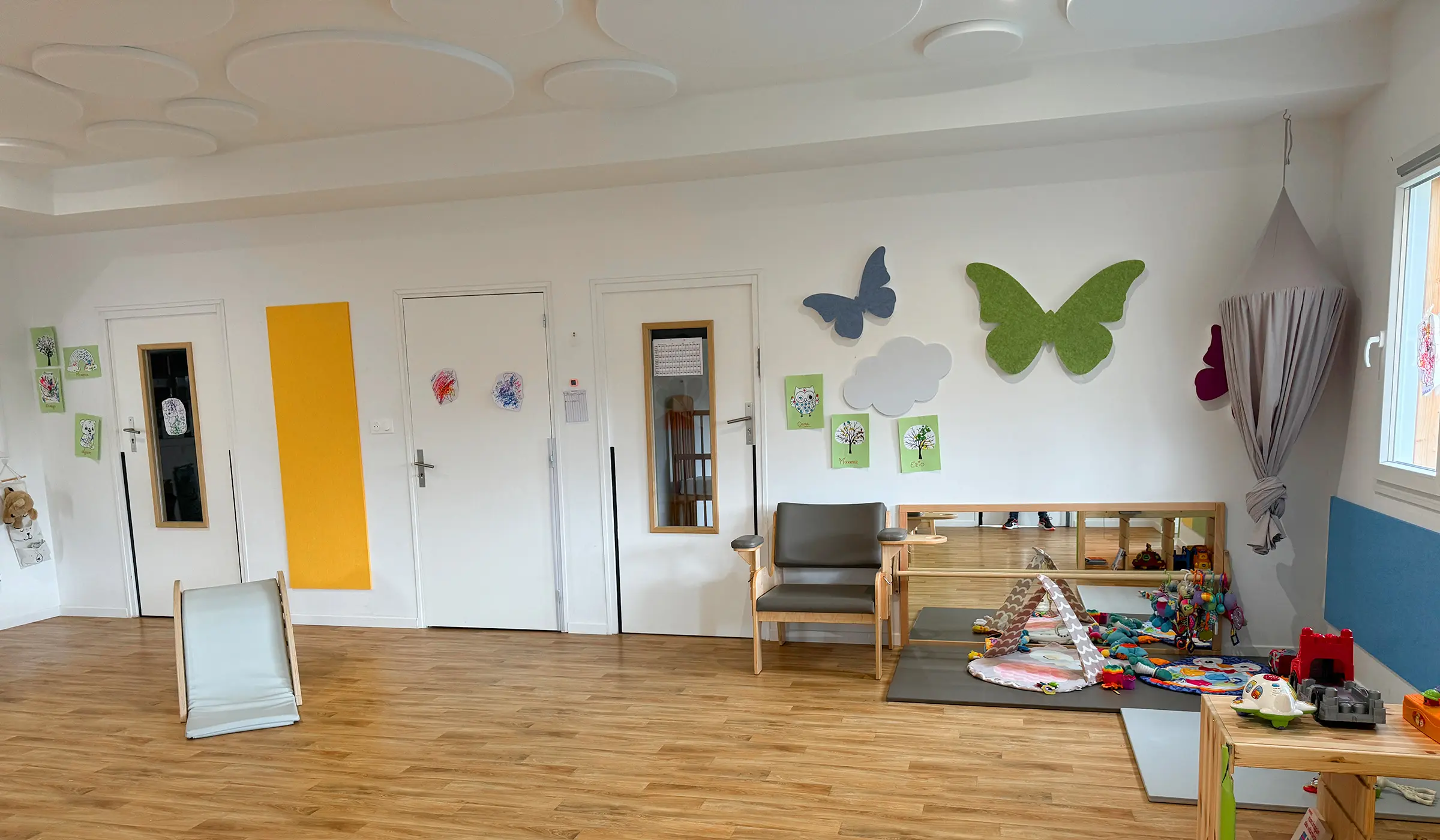 Cette crèche, construite en 2023, a fait face à une très forte réverbération dans sa salle d’éveil, due à un plafond en placo inadapté à son activité.