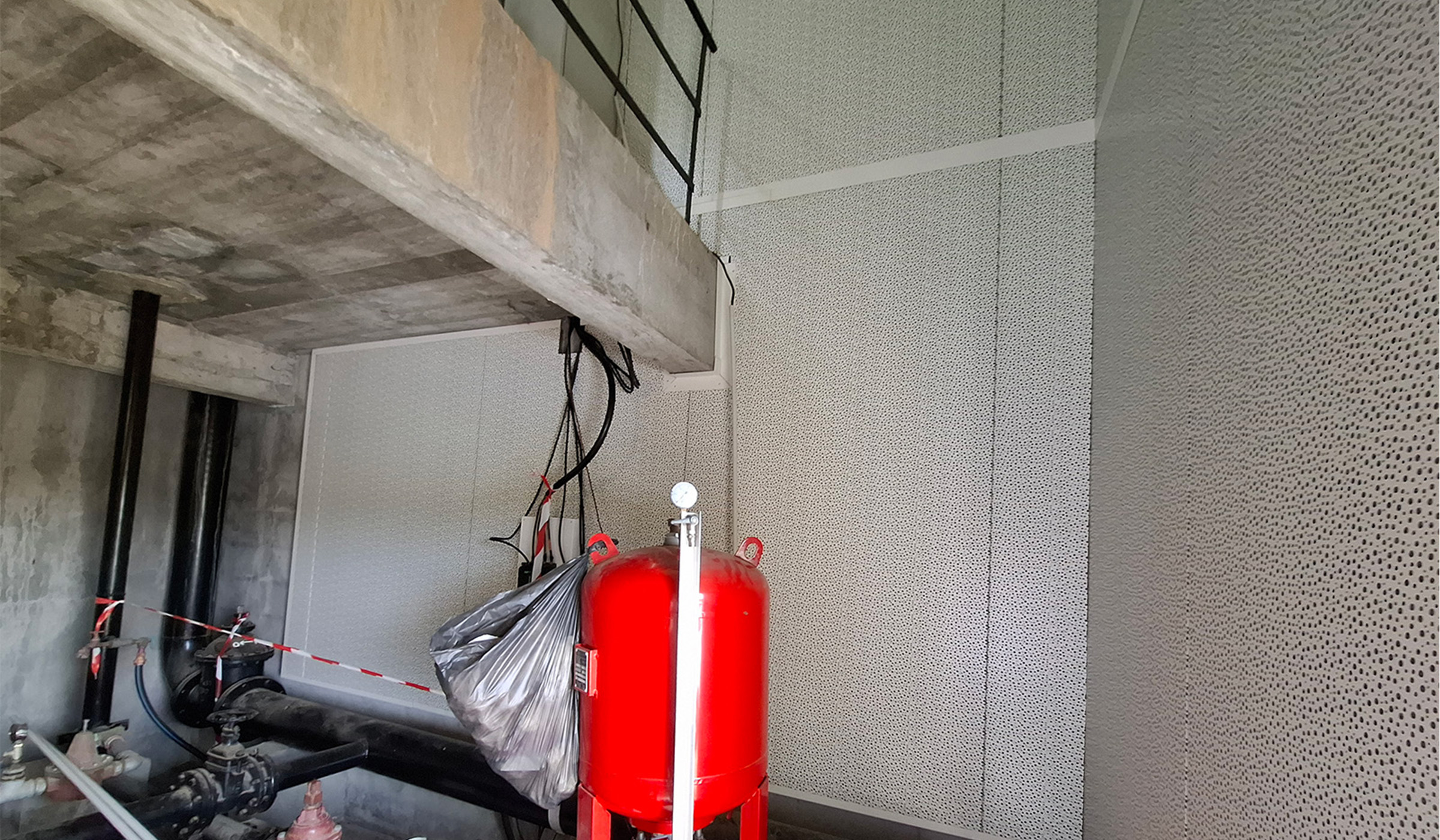 À la suite du diagnostic acoustique, plusieurs solutions techniques ciblées ont été mises en œuvre pour traiter efficacement les émissions sonores du local pompe :